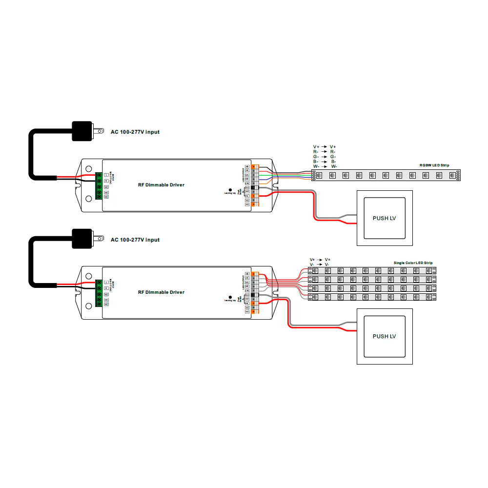 The SRP-1009-75W-CV is a high-performance 75W constant voltage LED driver, offering dimming capabilities with a single 24VDC output channel. Designed to operate within a 200-277VAC input voltage range, it features a power factor exceeding 0.9 and an efficiency rate of over 85%. This driver ensures seamless and ultra-deep dimming down to 0.1% without any flickering. Equipped with an RF control interface, it is fully compatible with the SR-1009 series RF remotes. By integrating a WiFi-RF transmitter, it can be managed through an app available for both iOS and Android devices. Additionally, the driver supports brightness adjustment when connected to a standard switch, enhancing its versatility and ease of use.