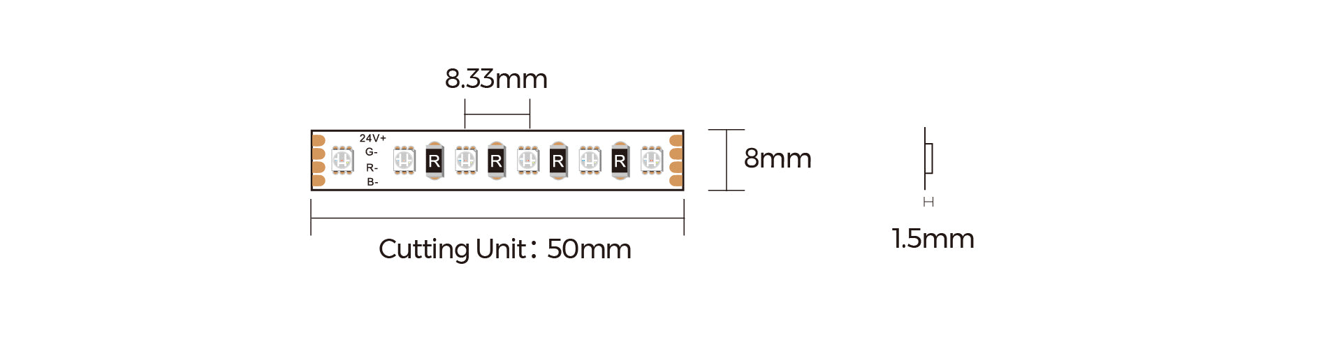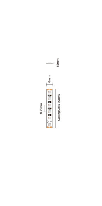 LED strip DA120RGB-24V-8mm from ColorsLED is a powerful solution for RGB lighting, creating brightness up to 430 lm/m with power consumption of 10-11 W/m. Suitable for creating dynamic lighting effects in various spaces thanks to the 50mm cutting pitch and IP33 protection options. Operates at temperatures from -25°C to 40°C and is UL and CE certified, ensuring durability and reliability for both indoor and outdoor projects.