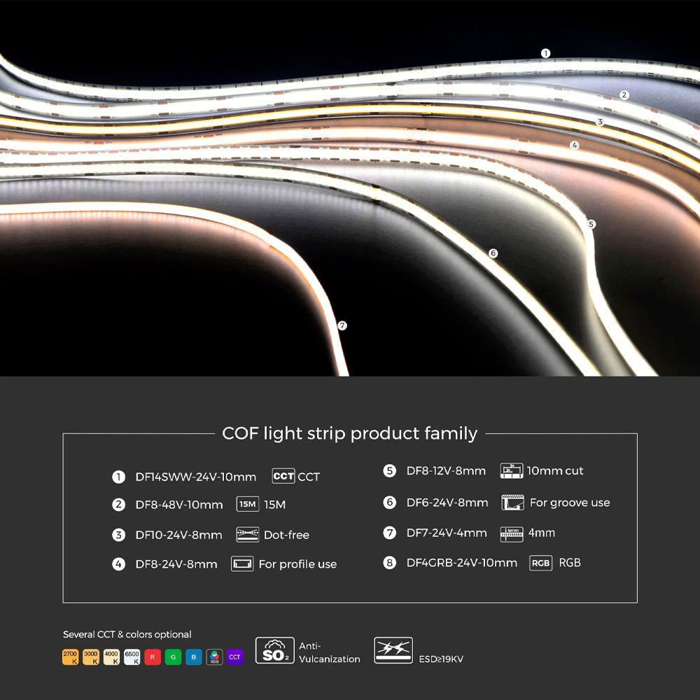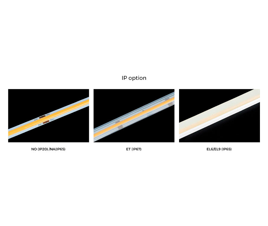 LED strip with COB chip provides smooth and uniform light along its entire length with no visible dots. COB (Chip On Board) technology allows a large number of LEDs to be placed on a single substrate, providing high brightness and uniformity of light with low power consumption. With increased flexibility and color temperature options, the strip is ideal for accent, decorative and main lighting. It is durable, has low heat dissipation and is suitable for areas with high demands on light quality and uniformity.