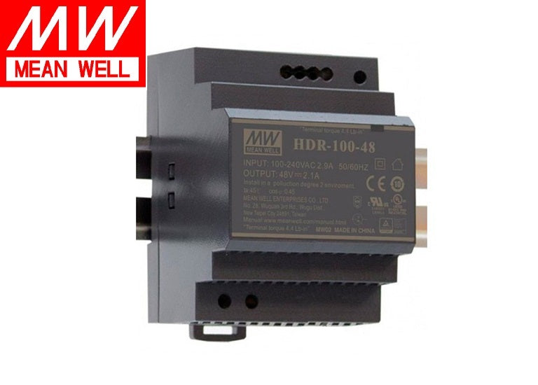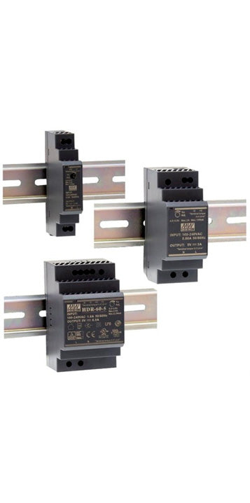 Mean Well HDR-100 Series 12, 24 and 48 volt DIN rail mount power supplies are compact and reliable power supplies for automation, lighting control and industrial applications. These power supplies are suitable for installation in distribution boards and provide stable voltage under a variety of conditions. The HDR series from Mean Well features high efficiency, overload protection, compact size and low power consumption. The ideal choice for industrial and home applications where ease of installation and power stability are required. Order HDR units for your DIN rail and keep your systems running smoothly!