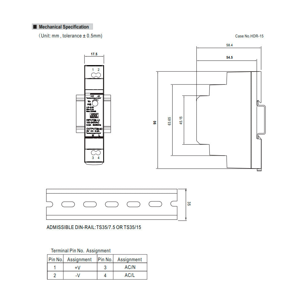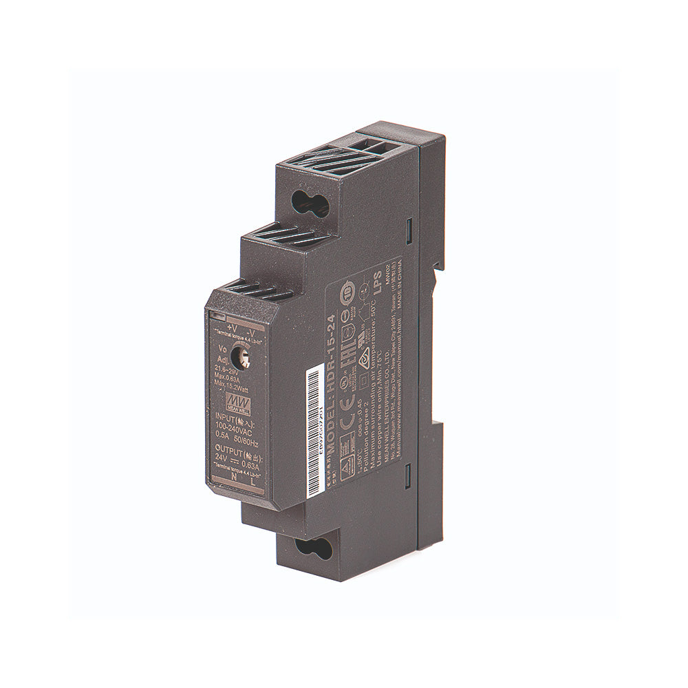 HDR-15 is one economical ultra slim 15W DIN rail power supply series, adapt to be installed on TS-35/7.5 or TS-35/15 mounting rails. The body is designed 17.5mm(1SU) in width, which allows space saving inside the cabinets. The entire series adopts the full range AC input from 85 VAC to 264VAC(277VAC operational) and conforms to BS EN/EN61000-3-2, the norm the European Union regulates for harmonic current. HDR-15 is designed with plastic housing that it can effectively prevent user from electric hazards. With working efficiency up to 87%, the entire series can operate at the ambient temperature between -30°C and 70C under air convection. The complete protection functions and relevant certificates for home automations and industrial control apparatus (IEC62368-1, UL508, UL62368-1, BS EN/EN61558-2-16) make HDR-15 a very competitive power supply solution for household and industrial applications.