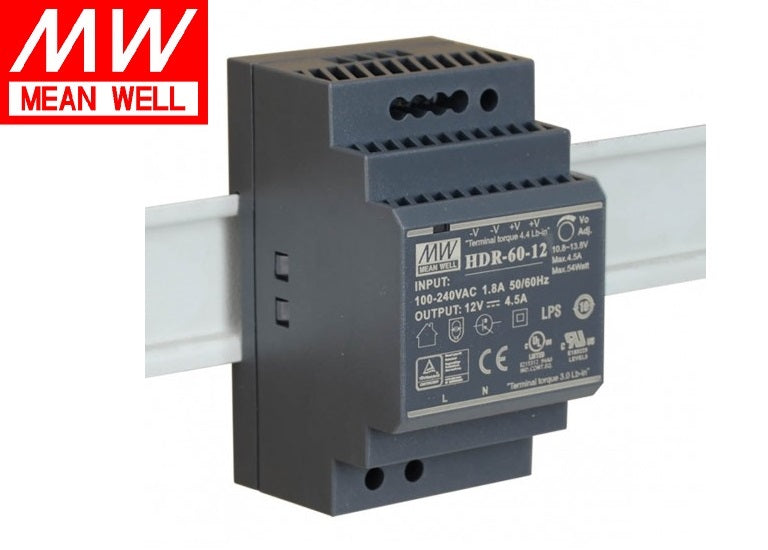 Mean Well HDR-60 Series 12, 24 and 48 volt DIN rail mount power supplies are compact and reliable power supplies for automation, lighting control and industrial applications. These power supplies are suitable for installation in distribution boards and provide stable voltage under a variety of conditions. The HDR series from Mean Well features high efficiency, overload protection, compact size and low power consumption. The ideal choice for industrial and home applications where ease of installation and power stability are required. Order HDR units for your DIN rail and keep your systems running smoothly!