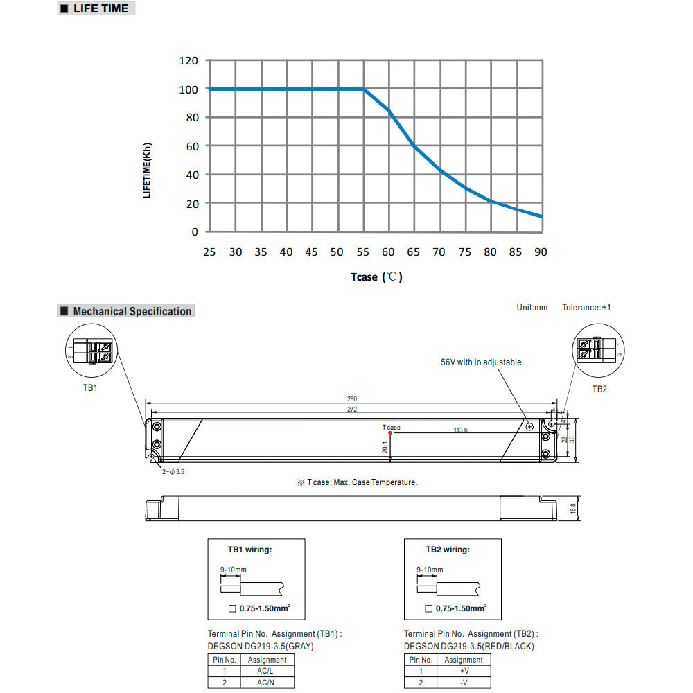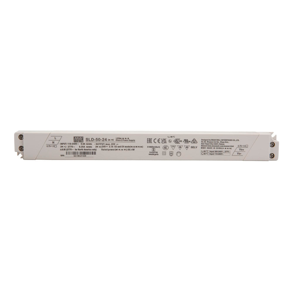 SLD-50 series is a 50W AC/DC LED driver featuring the dual modes constant voltage and constant current output. SLD-50 operates from 110~305VAC and offers models with different rated voltage ranging between 12V and 56V. Thanks to the high efficiency up to 90%, with the fanless design, the entire series is able to operate for -20°C - +90C case temperature under free air convection. SLD-50 design with low profile and linear housing which is good for signage and linear luminaire applications.