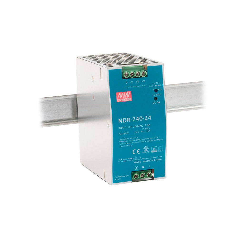 Mean Well NDR-240 Series 12, 24, and 48 volt power supplies in perforated metal DIN rail mount enclosures are an efficient solution for industrial equipment and automation applications. The perforated housing provides superior cooling, extending life and improving reliability even under heavy loads. The NDR Series offers compact size, energy efficiency and built-in overload, short circuit and overvoltage protection. Ideal for lighting, automation, telecommunications equipment and other industrial applications. Order Mean Well NDR DIN rail power supplies and ensure stable power supply and longevity of your systems!